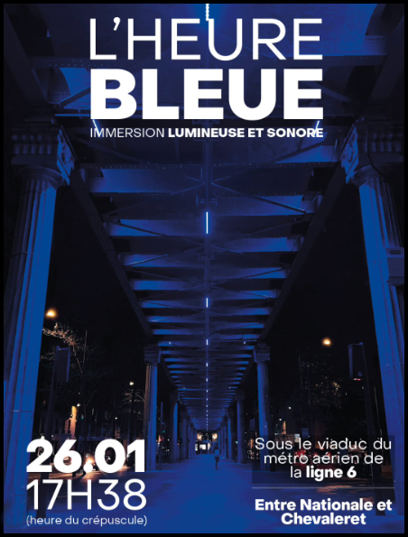 Dès le lundi 26 janvier 2026 à 17h38, sous le viaduc de la ligne 6 dans le 13e arron-dissement, entre les stations Nationale et Chevaleret, Paris va vibrer et scintiller. L’Heure Bleue ouvre le rideau du crépuscule : une immersion sonore et lumineuse dès 17h30, où la lumière et la musique transforment le béton en scène et le ciel en projecteur. Chaque faisceau, chaque note, invite les promeneurs à plonger dans une expérience sensorielle unique, le temps d’une heure exactement, avant que le viaduc ne reprenne son éclairage patrimonial.