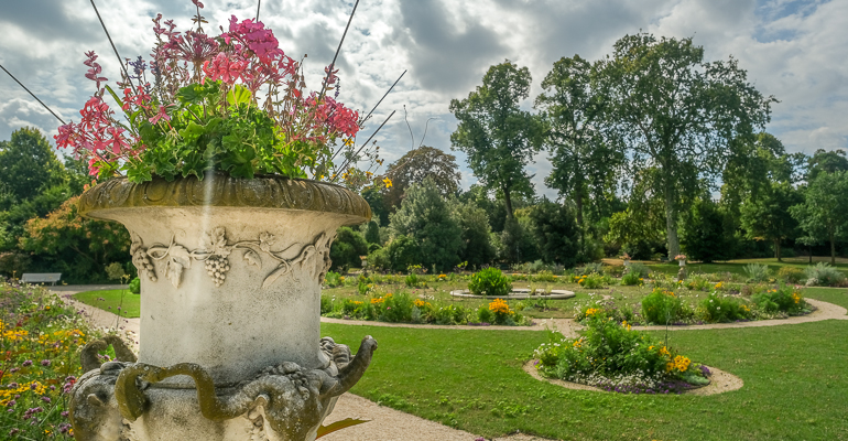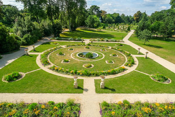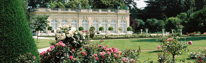 Face à l'orangerie, un magnifique parterre fleuri aux couleurs chatoyantes, préparent vos yeux à l'éclat incomparable des rosiers de Bagatelle (1 200 variétés).