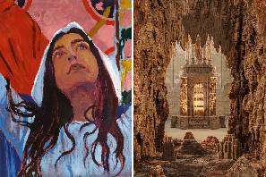 Eva Jospin réunit plus d’une quinzaine d’œuvres, certaines créées spécialement pour l’exposition et dévoilées pour la première fois, d’autres revisitant des motifs emblématiques de son travail. Le titre de l’exposition, "Grottesco", s’inspire de la légende d’un jeune Romain tombé par hasard dans une cavité où il découvre des fresques oubliées de la Domus Aurea. À partir de ce palais enseveli, semblable à une grotte, naît le "grotesque" dont Eva Jospin tire le fil : un style où le végétal, l’architectural et le fantastique s’entrelacent. Le parcours invite à une traversée dans un monde à part : promontoire, cénotaphe, grotte, ruines et forêt se succèdent, transformant sans cesse la perception et révélant de nouveaux motifs. Parmi les pièces inédites, une série de bas-reliefs brodés attire le regard. Fusion de textile et de sculpture, ces œuvres marquent une nouvelle étape dans la recherche d’Eva Jospin.