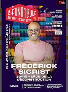 Humoriste à la carrière riche en chroniques radio et télé — France Inter notamment, dont il connaît bien les longs couloirs à moquette — Frédérick Sigrist revient sur la tranche d'âge la plus marquante de sa vie dans son nouveau spectacle : " 39 – 45 ", l'âge de la déconstruction. Mais comment se déconstruire si l'on n'a jamais été construit ?