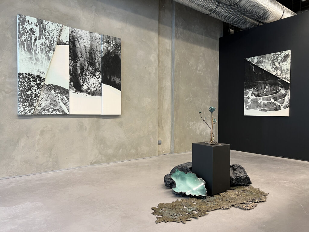 Osez « rêver l’obscur » en compagnie d’une véritable magicienne. Après ses envoûtantes Aubes chimériques du Palais de Tokyo, Eva Medin revisite une fois de plus nos imaginaires autour de la mutation et de la métamorphose en nous réservant ce joli tour de magie : Les eaux nocturnes. Un ballet visuel hypnotisant situé quelque part entre tapisserie, peinture et cinématographie, déployé sur l’ensemble des 200m2 du Centre Wallonie Bruxelles. La dernière lauréate en date du prestigieux prix Art [ ] Collector Entreprise ensorcèle ainsi une nouvelle fois la scène parisienne avec cette fascinante exposition imaginée dans le prolongement de sa fable surréaliste Le jour après la pluie. Ses dessins-collages ont cependant laissé place à des toiles gigantesques recouvertes de mystérieuses tâches noires liquides. Identiques à l’eau, similaires à la terre, ces traces brouillent volontairement nos perceptions, créant sous nos yeux de nouveaux espaces fictifs enchanteurs. Eva Medin unit ici la nature à la sculpture pour donner naissance à un paysage transfiguré en perpétuel mouvement. Espérons que nous puissions retrouver notre chemin à la fin de cette parenthèse artistique hors du temps…