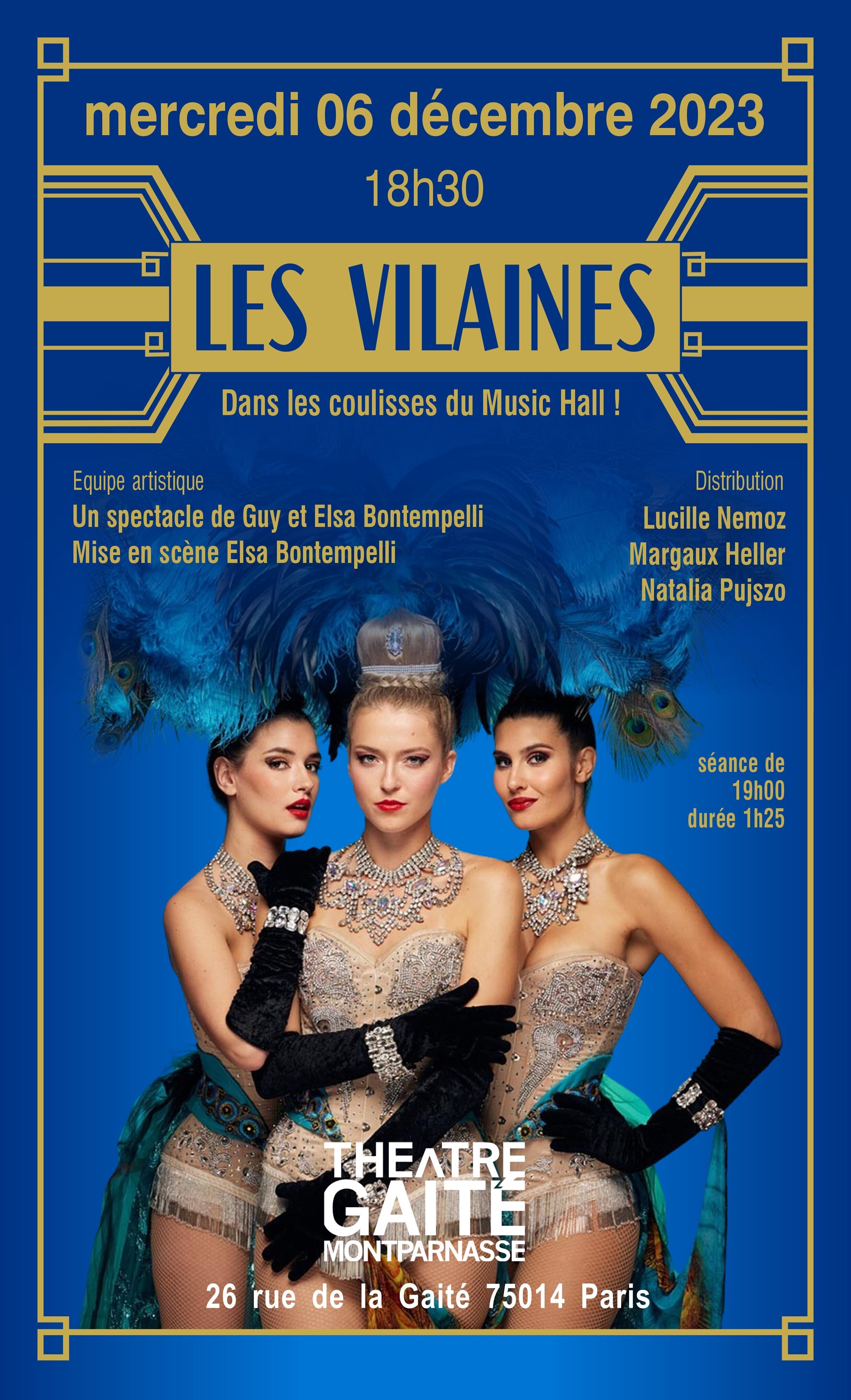 Si tout le monde connait de loin le monde voluptueux des cabarets mythiques parisiens, vous ne pourrez jamais soupçonner ce qui s’y passe dans les coulisses. Le trio des Vilaines vous conduit avec humour, poésie et une pointe de féminisme dans cet univers chatoyant. Les textes d’Elsa et Guy Bontempelli sont remarquables d’efficacité servis par trois comédiennes-chanteuses attachantes et pleines de talent. Le faste des costumes et la