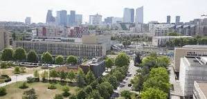 Dans la perspective majeure de la Grande Arche, vers l’ouest, les vingt Terrasses mènent vers la Seine.