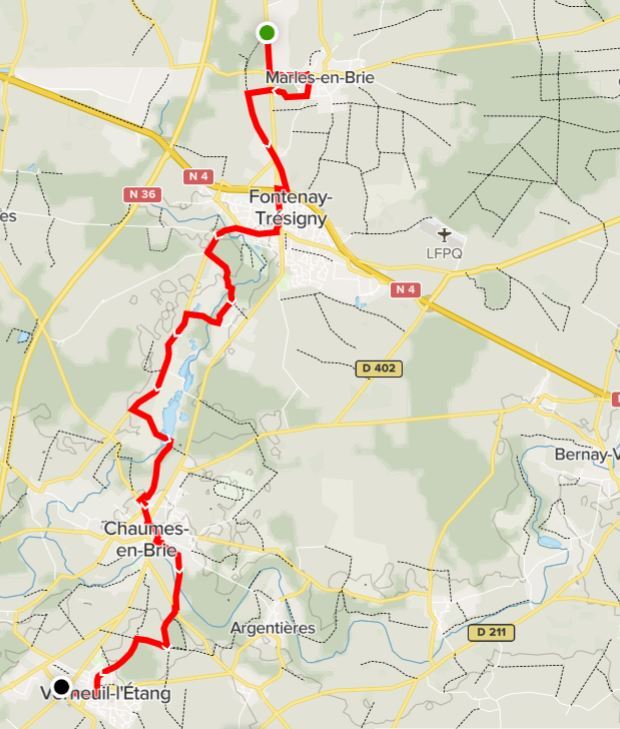 Nous repartons de la gare de Marles-en-Brie (77). Après un crochet par le village nous descendrons plein sud vers celui de Fontenay-Trésigny (77).